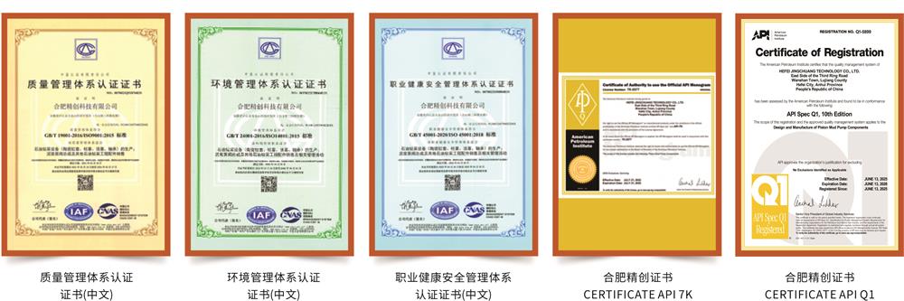 公司擁有一套完善的質量管理體系,通過了 ISO/9001 質量管理體系、ISO14001環境管理體系 、ISO45001 職業健康安全管理體系認證,取得了美國石油協會API 7K和API Q1產品體系認證。